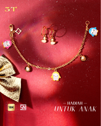 Koleksi set perhiasan emas 18K ini hadir dengan desain penguin dan bebek yang menggemaskan sehingga cocok untuk dijadikan hadiah spesial bagi bayi. Dalam satu setnya terdapat rantai gelang charm berhias lonceng mutiara, liontin penguin berwarna cerah, serta anting hoop kecil berbentuk bebek yang menarik perhatian.